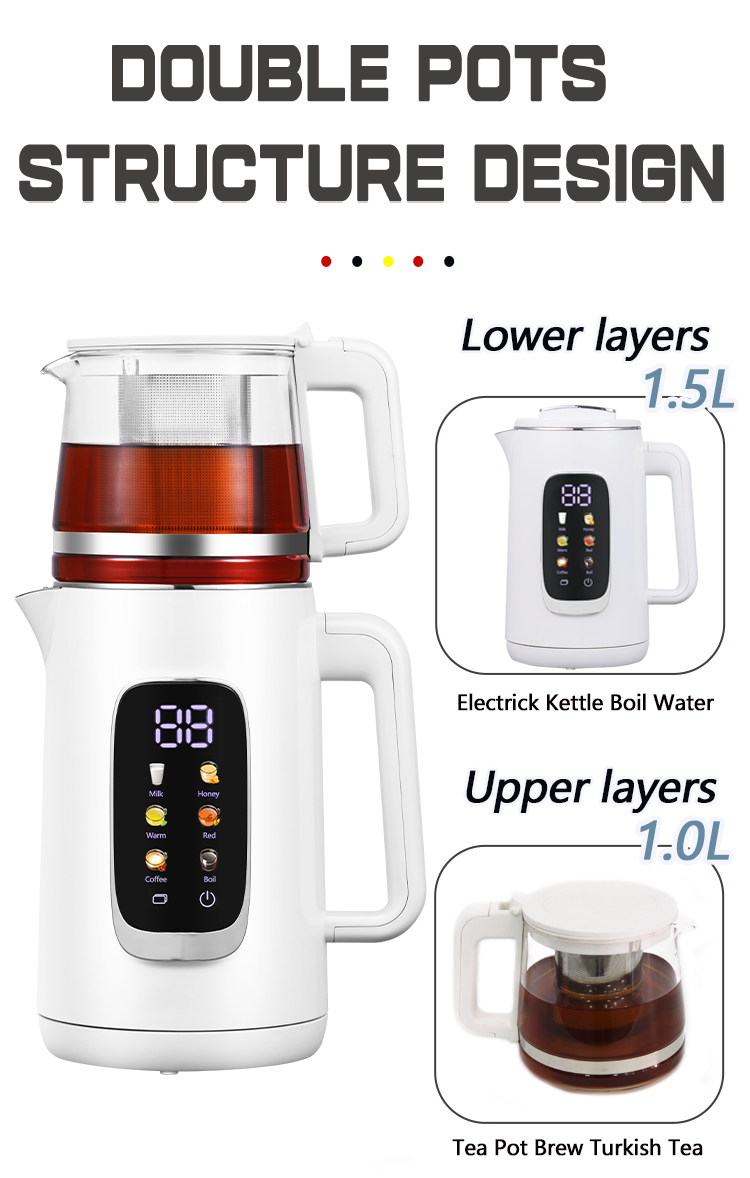 - Конструкция двойной кастрюли: электрический турецкий самовар, чайник для быстрого кипячения воды, имеет конструкцию двойной кастрюли. Нижний уровень — электрический чайник объемом 1,5 л для кипячения воды, а верхний — чайник объемом 1,1 л для заваривания турецкого чая. Этот турецкий чайник «Русский русский чайник» позволяет одновременно кипятить воду и заваривать чай, экономя время и силы.